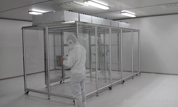 潔凈棚采用工業(yè)鋁材(或不銹鋼方通、鐵方通噴塑)作為框架,風(fēng)機(jī)濾網(wǎng)機(jī)組(FFU)送風(fēng),四周懸掛防靜電垂簾(或鋼化玻璃),其內(nèi)部凈化級別可達(dá)到100-10000級。適用于操作區(qū)內(nèi)局部凈化級別要求高的區(qū)域。