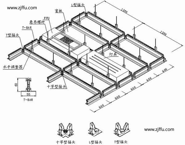 模數(shù)尺寸(ceiling modular size):安裝吊頂龍骨中心線的間距,F(xiàn)FU常用的標(biāo)準(zhǔn)模數(shù)尺寸為1200X600(4’X2’),1200X900(4’X3’),1200X1200(4’X4’)。