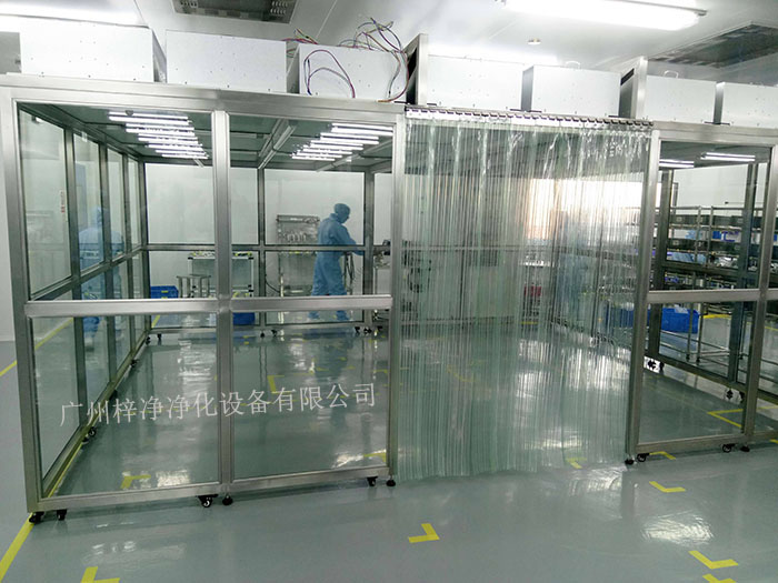 潔凈棚它主要從FFU頂部將空氣吸入,經(jīng)初效過濾器,高效過濾器過濾,過濾后的潔凈空氣在整個出風(fēng)面以0.45m/s±20%的風(fēng)速勻速送出到潔凈棚內(nèi)。形成均流層,使?jié)崈艨諝鈿饬鞒蚀怪眴蜗蛄?,從而保證了工作區(qū)內(nèi)所要求的潔凈度。潔凈棚等級通常分為百級潔凈棚,千級潔凈棚,萬級潔凈棚。