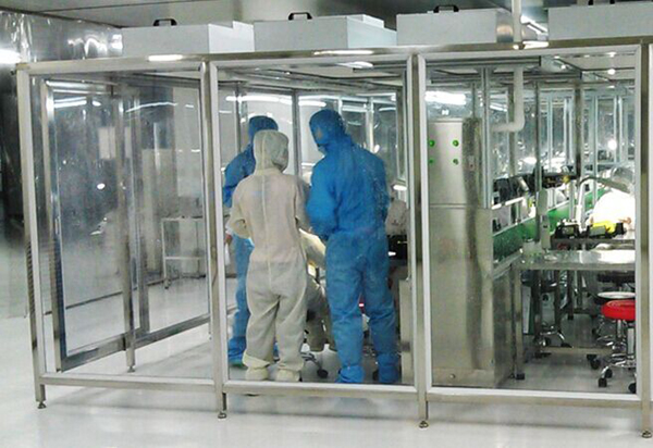 潔凈棚采用工業(yè)鋁材(或不銹鋼方通、鐵方通噴塑)作為框架,風(fēng)機(jī)濾網(wǎng)機(jī)組(FFU)送風(fēng),四周懸掛防靜電垂簾(或鋼化玻璃),其內(nèi)部凈化級別可達(dá)到100-10000級。適用于操作區(qū)內(nèi)局部凈化級別要求高的區(qū)域。