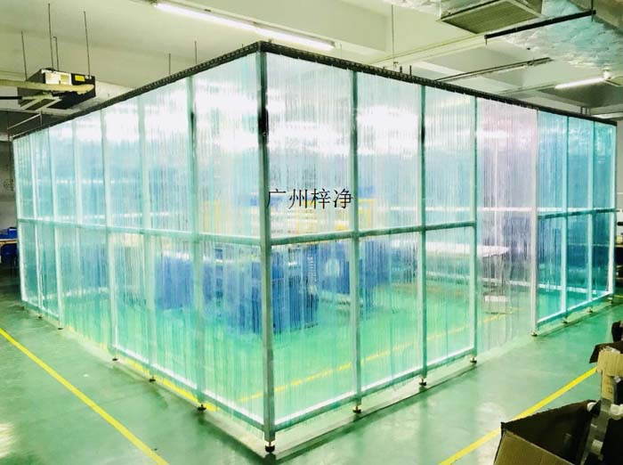 潔凈棚采用工業(yè)鋁材(或不銹鋼方通、鐵方通噴塑)作為框架,風(fēng)機(jī)濾網(wǎng)機(jī)組(FFU)送風(fēng),四周懸掛防靜電垂簾(或鋼化玻璃),其內(nèi)部凈化級(jí)別可達(dá)到100-10000級(jí)。適用于操作區(qū)內(nèi)局部凈化級(jí)別要求高的區(qū)域。